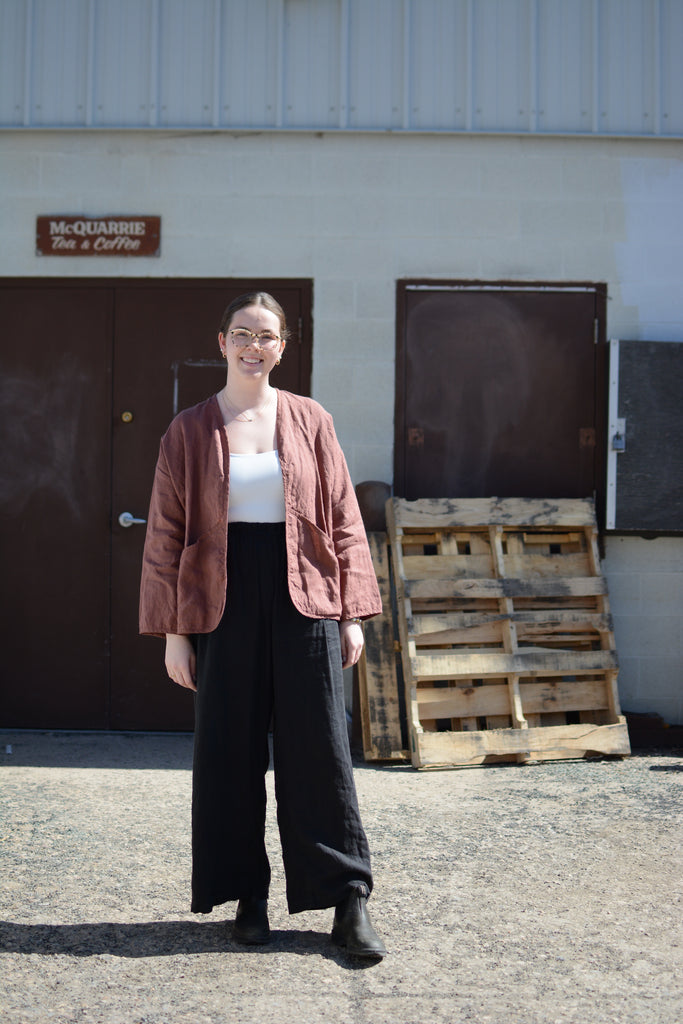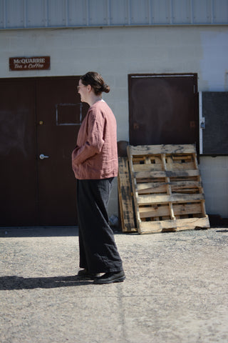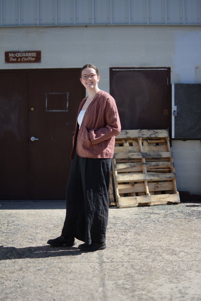 • Buttonless linen jacket designed to be worn as an easy 'throw-on' jacket.