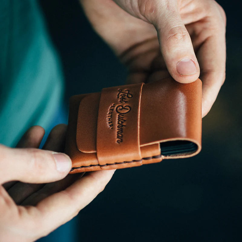 The Finnigan – the minimal card holder built to last a lifetime. Made 100% in the USA, this leather card wallet easily fits 8+ cards and folded cash, with a flap that keeps contents secure. All while remaining barely bigger than a credit card. With full-grain leather, a lifetime stitching guarantee, and endless customization, it's just wrong to settle for less. This is what true minimalism looks like.