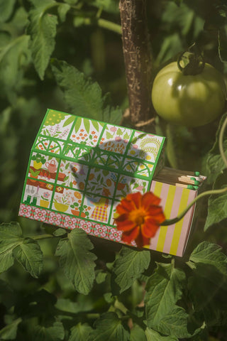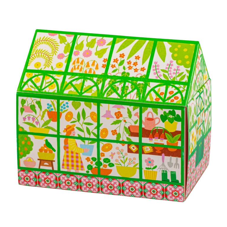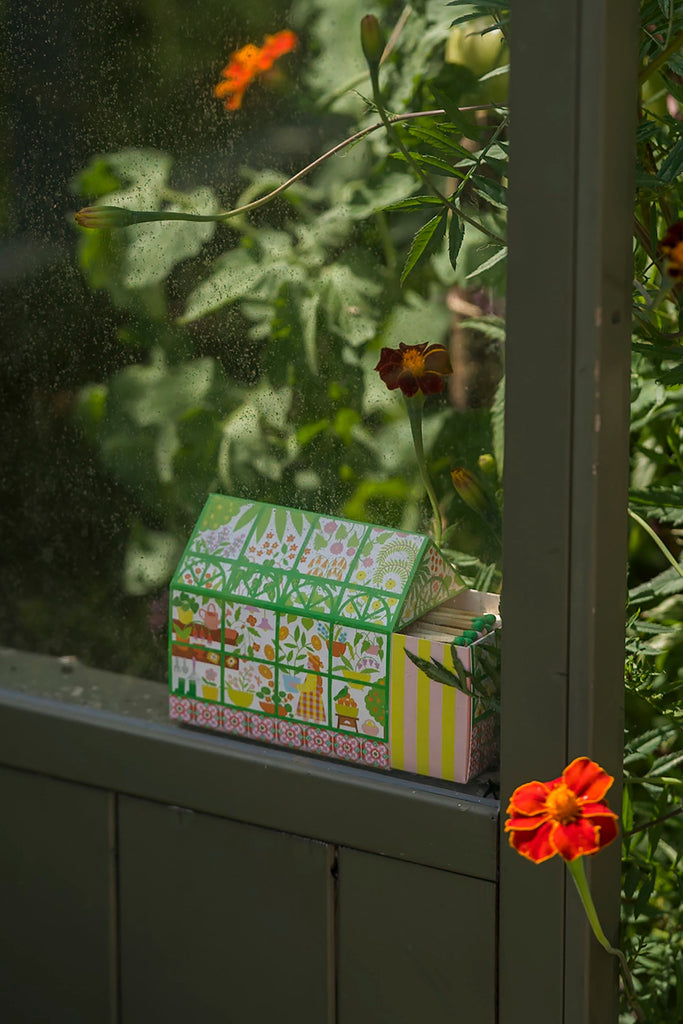 House shaped matchbox featuring the illustration of a greenhouse in full bloom and a woman stood inside carrying a plant pot.