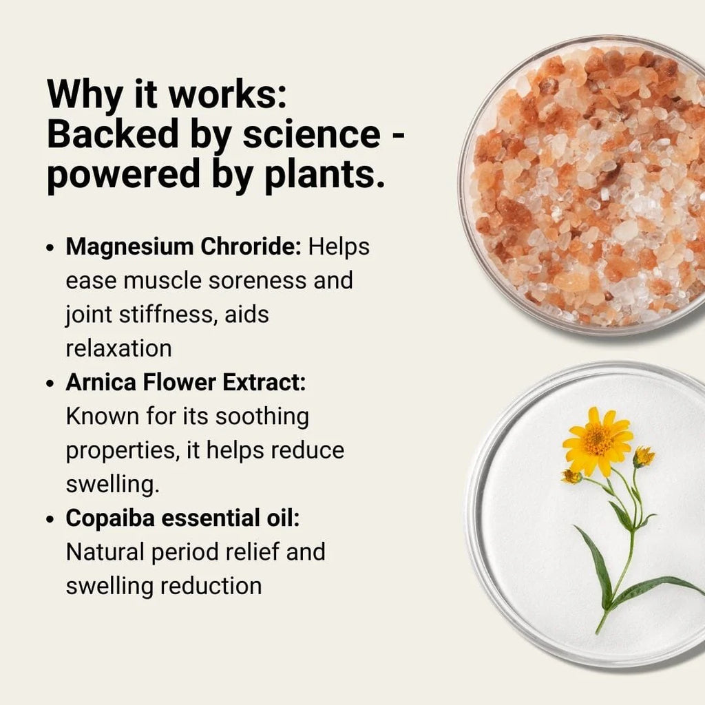Magnesium chloride, Arnica montana flower extract, Sunflower seed oil, Copaiba essential oil, Frankincense essential oil