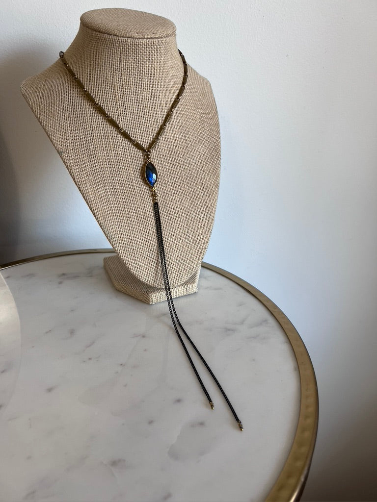 Lariat-style necklace on facetedbrass bar chain featuring amarquise-shaped facetedLabradorite gemstone,Hematite, and lariat tails ofblack brass sparkle chain.Length:Necklace chain - 15”Lariat tails 8” and 9” fromgemstone
