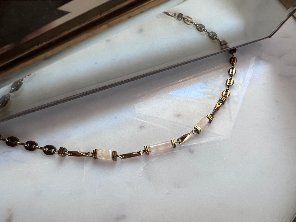 Collar length necklace on ovalconnector chain, featuring a barpendant of faceted brass bars,Yellow Aventurine, Carnelian,and Hematite beads.Length: 16.25” with 1” extender