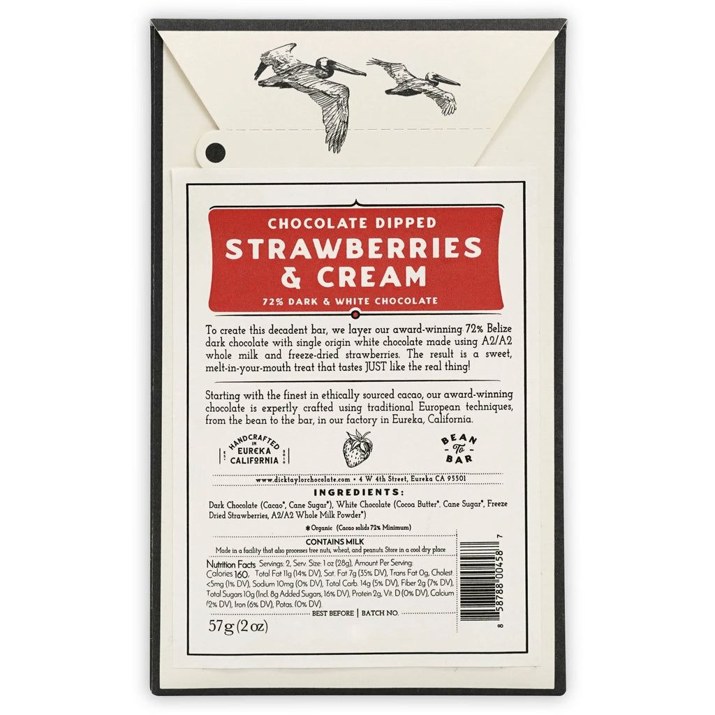 To create this decadent bar, Dick Taylor layered their award-winning 72% Belize dark chocolate with single-origin white chocolate made using A2/A2 whole milk and freeze-dried strawberries. The result is a sweet, melt-in-your-mouth treat that tastes JUST like the real thing!